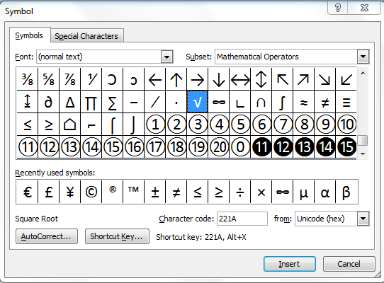 · choose normal text, then mathematical operators. · type 221a or 221a (does not matter, uppercase or lowercase), immediately after that press alt+x to insert the square root symbol: Learn how to type the square root symbol using the equation tool in microsoft word 2010. Automatically the design tab appears. To type the square root symbol in word on your keyboard, press down the alt key and type the square root symbol alt code (i.e.